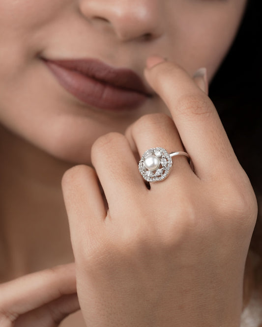 American Diamond Silver White Pearl Pleted Delicate Adjustable Free Size Ring