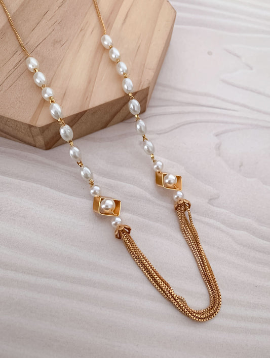 Elegant Pearl & Gold Chain Mala – Statement Fancy Necklace