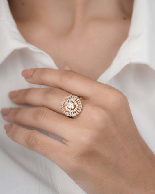 American Diamond Rose Gold Ovel Chowki Diamond Adjustable Free Size Ring