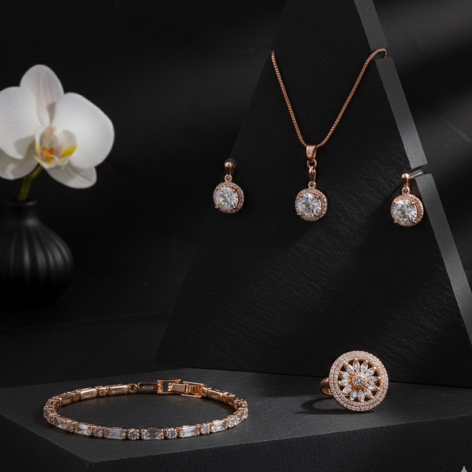 Celebrate love this Valentine’s Day with the Forever Sparkle Rose Gold Valentine Combo, a complete jewellery set designed to make her feel truly special. This elegant combo includes a shimmering CZ pendant necklace, matching stud earrings, a dazzling tennis bracelet, and a statement sparkle ring, all finished in a romantic rose-gold tone.