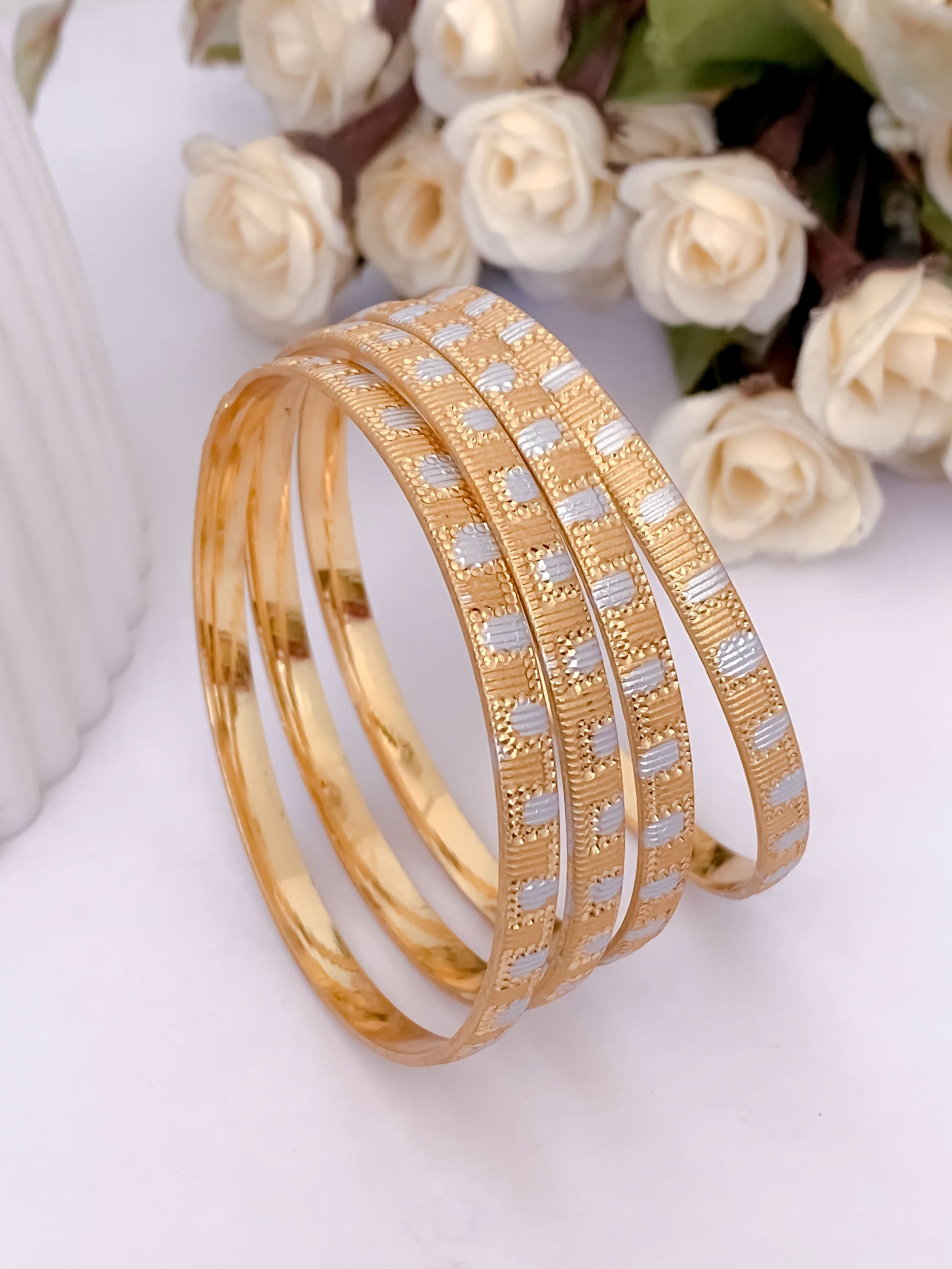 Get twice the style with our Buy 1 Get 1 Free deal on the Kritika Bangals set of 4! Elevate any outfit with these beautiful and versatile bangles. With this offer, you can mix and match to your heart's content without breaking the bank. Don't miss out!