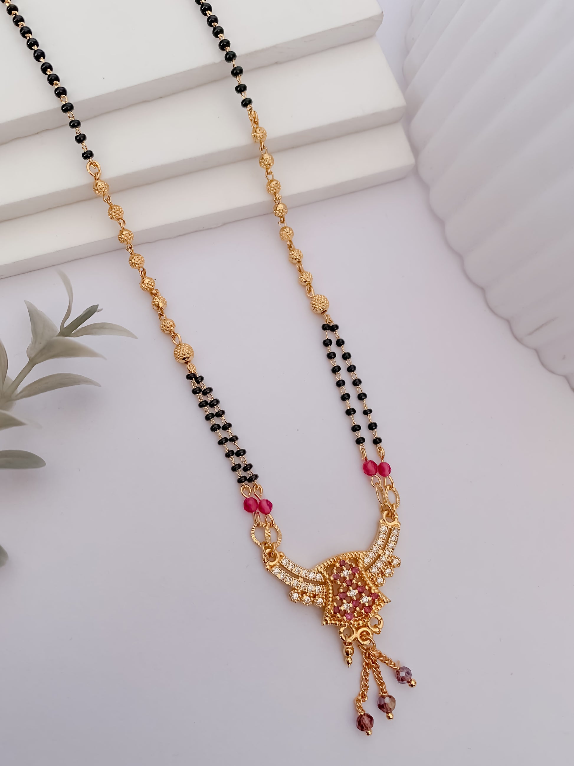 This designer mangalsutra showcases a beautifully crafted wing-inspired centerpiece adorned with ruby-toned stones and shimmering white accents. The elegant black bead chain paired with delicate gold detailing adds a regal charm while keeping the look graceful and wearable. Finished with subtle dangling beads, this piece brings together tradition and statement design effortlessly.