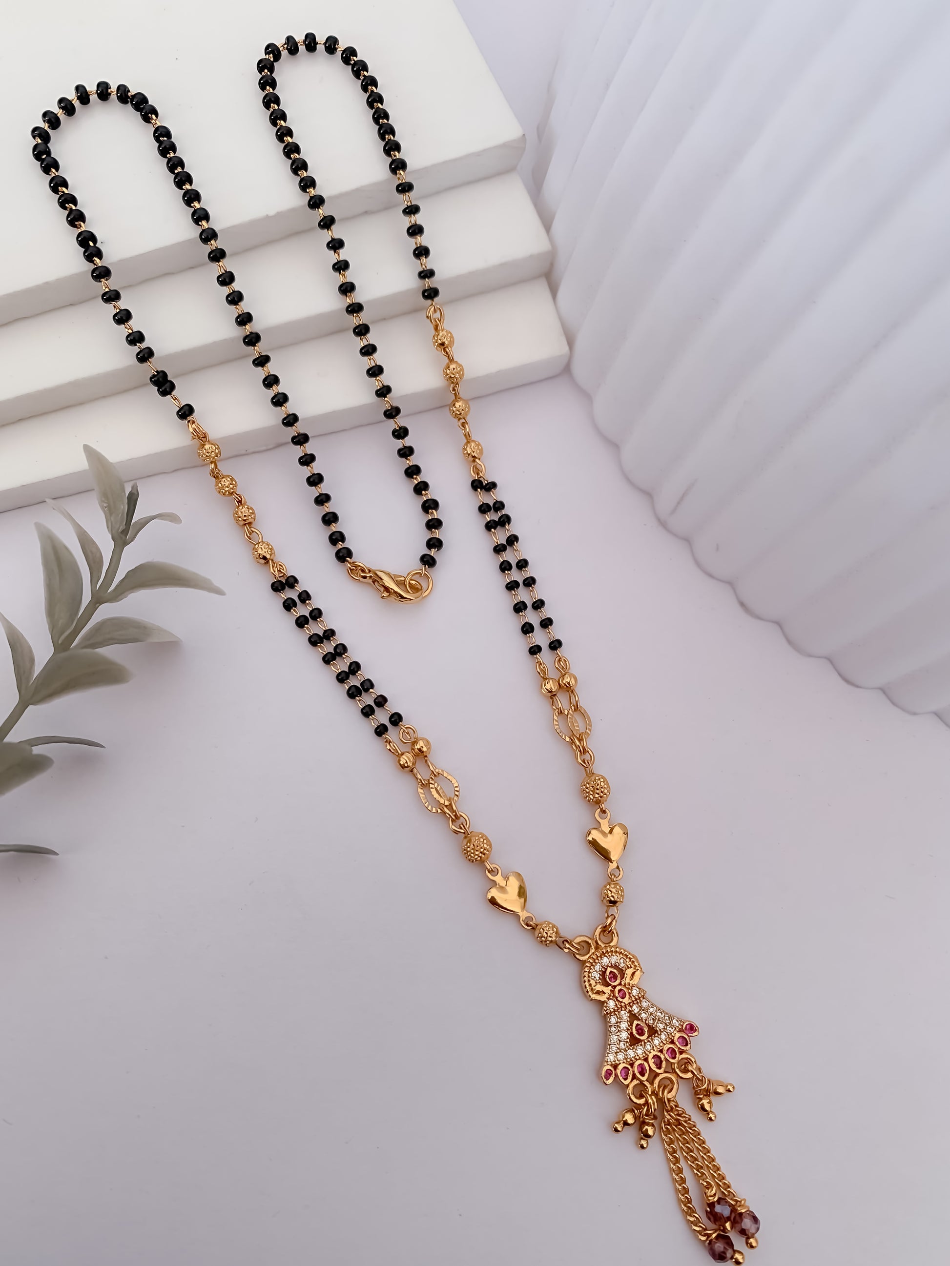 Celebrate timeless tradition with a graceful touch of modern elegance. This gold-tone mangalsutra features classic black beads paired with a beautifully crafted designer pendant, finished with intricate detailing and a delicate dangling accent. Lightweight yet eye-catching, it’s designed for everyday comfort while keeping a traditional soul alive.